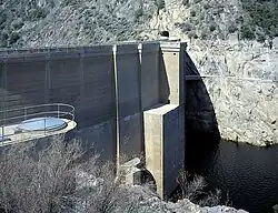 Between 1934 and 1938 the line was pressed back into construction service while the height of the dam was increased from 364 feet (111 m) to the present 430 feet (130 m) above bedrock.[2] Since repairs were necessary before the line could again haul heavy freight to support construction hauling, and it was the height of the Great Depression, an Emergency Relief Act provided about 600 workers to refurbish the line. Operations of the restored line were turned over to the Sierra Railroad, and the reconstituted railroad started operations May 13, 1935, with a train of four cars powered by Sierra engines #30 and #32.