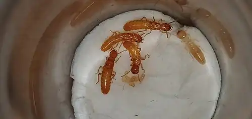 Workers build up the majority of a colony along with many soldiers. Workers perform tasks such as food gathering, nest expanding, care for reproductive and brood, while soldiers perform the task of defending intruders. The soldier will excrete a slightly grey-tinted sticky white liquid when disturbed and are also found to bump their heads into nest walls to alert fellow colony members about arriving danger.