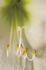 The androecium consists of six stamens with filiform (thread like) filaments, which are fasciculate (in close bundles) and declinate or ascendent. The anthers are dorsifixed or versatile.[26] In the gynaecium, the ovary is inferior and trilocular with pluriovulate locules.[27] The style is filiform, and the stigma trifid. The fruit forms a trivalve capsule containing seeds which are dry, flattened, obliquely winged or irregularly discoid, hardly ever turgid, and globose (spherical) or subglobose, with a brown or black phytomelanous testa.[28]