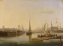 Anne of Denmark came to Bristol in June 1613 and was welcomed by the mayor Abel Kitchin. The visit featured a pageant on the river, with an English ship attacked by Turkish galleys, which the queen watched from the Canon's Marsh meadow near the Cathedral.[67] An English victory was signalled by the release of six bladders of pig's blood poured out of the ship's scupper holes.[68]