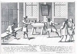 Around the same time, a number of significant fencing manuals were written in or translated into English.[22][23][24] Prizefights were bloody but rarely lethal. Samuel Pepys describes visiting at least two prizefights held in London's Beargarden in 1667 – the contestants were tradesmen rather than fencing masters; both fights ended after one of the contestants was unable to continue because of wrist injuries.[25] On the whole, the English public opinion of fencing during this period was rather low; it was viewed in much the same light as cage fighting today.