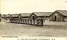A camp with a capacity of 27000 soldiers[14] was also set up in March 1916 at a place called "Le Courneau" in Gironde, between the road leading from La Teste to Cazaux and the canal connecting the pond of Cazaux and Sanguinet to the Arcachon Bay. It is estimated that 40,000 Senegalese tirailleurs and their staff stayed in the camp at some point, it could simultaneously accommodate about 18,000 men and their 300 officers and petty officers at the same time.[15] It was also used a transit camp for tirailleurs en-route to hivernage in Northern Africa.[16] The location of the camp next to a swamp, the insalubrious living conditions and the poor quality of the accommodation favoured the spread of epidemics.[17] In September the construction of the camp was completed and more than two hundred deaths had already been suffered.[18][19]