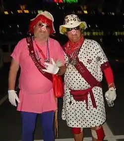 The Hogettes were founded in 1983 when Michael Torbert went to a Halloween party at his grandmother's retirement home wearing one of her old dresses as a costume. The costume was such a hit that he gathered a group of men who he "thought were tough enough to go out in public in a dress".[1] On November 27, 1983, the group attended their first Washington Redskins football game in full drag, but with the addition of pig snout masks, in reference to The Hogs, the nickname of the Redskins offensive line players in the 1980s.[2] The group would also go to children's hospitals to cheer up sick children.
