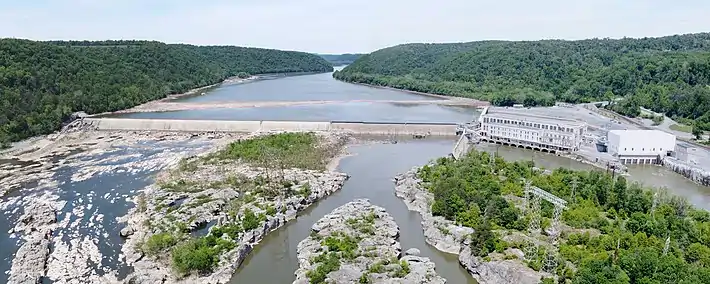 Holtwood Dam (also Holtwood Hydroelectric Dam, Holtwood Hydroelectric Plant, McCalls Ferry Dam) is the oldest of three major dams built across the lower Susquehanna River, and the middle location of the three. It was constructed as the McCalls Ferry Dam between 1905 and 1910 by the Pennsylvania Water & Power (PW&P) Company. The dam was renamed Holtwood in honor of two company executives.[1] PW&P merged with Pennsylvania Power & Light (PPL) in 1955. In 2015 Talen Energy took over PPL's generation and immediately sold the Holtwood plant to Brookfield Renewable Energy Partners to comply with federal antitrust requirements.[2]