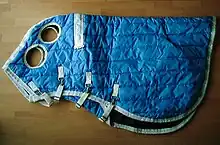 A horse blanket or rug is a blanket or animal coat intended for keeping a horse or other equine warm or otherwise protected from wind or other elements. They are tailored to fit around a horse's body from chest to rump, with straps crossing underneath the belly to secure the blanket yet allowing the horse to move about freely. Most have one or two straps that buckle in front, but a few designs have a closed front and must be slipped over a horse's head. Some designs also have small straps that loop lightly around the horse's hind legs to prevent the blanket from slipping sideways.[1]