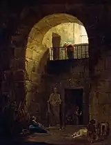 Robert was arrested in October 1793, during the French Revolution.[9] During the ten months of his detention at Sainte-Pélagie and Saint-Lazare he made many drawings, painted at least 53 canvases, and painted numerous vignettes of prison life on plates.[7] He was freed one week after the fall of Robespierre.[10] Robert narrowly escaped the guillotine when through error another prisoner with a similar name was guillotined in his place.[11]