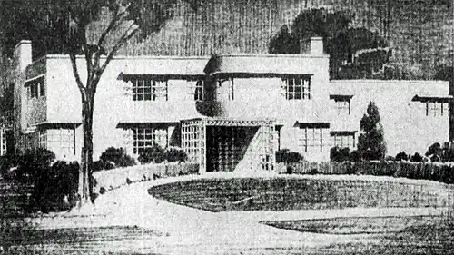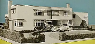 Buhs House was an extremely innovative home for its day in 1936, called in Architectural Record magazine "an outstanding example of modern architecture. The 'Made in Detroit' Home was built and equipped with materials made in Detroit and sponsored by the Detroit Board of Commerce."[53] Keyes followed much of the International Style of Swiss architect Le Corbusier, and even anticipated the stripped-down Functionalism exemplified in the 1930s in Sweden in Södra Ängby. In Buhs House, Keyes first experimented with a large, clean white brick façade and strict functionalistic themes of cubic volumes, flat-rolled sheet roofs, large windows, and rounded walls and balconies (Le Corbusier's "ocean liner" aesthetic) that he would gradually morph into his own Regency Moderne style.[3] Keyes designed the home for Lloyd H. Buhs.[54] (The Buhs's daughter, Martha Henry, became a notable American-Canadian actress. Lloyd Buhs, the secretary-treasurer of the Pfeiffer Brewing Company, was charged in 1943 with embezzling company funds to purchase a controlling interest in a small war plant.[55])