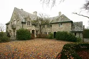 Built for (investment banker) Jerome E. Keane,[54] Keane House is a large Tudor of red brick and half-timbering. The design included Keyes's first use of a massive wall with slate-roofed pillars surrounding the estate, which matches and is incorporated into the brick façade of the house—an often-repeated motif later in his career. Multiple gables with intricate brick corbelling are a new Keyes motif (that he would use again and again, for example in 1928 in the Stoepel House on Touraine Road in Grosse Pointe Farms and later at Welch House and Woodland on Vaughan Road in Bloomfield Hills).