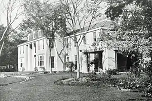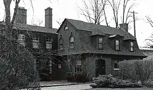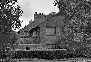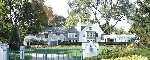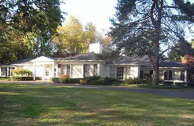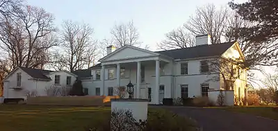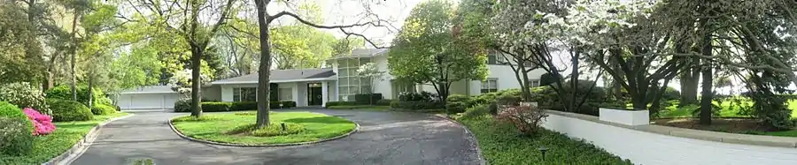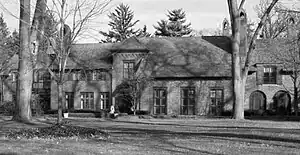 Designed by Keyes for Semon Emil "Bunkie" Knudsen[44] (Executive Vice President of General Motors Company and President of Ford Motor Company), Knudsen Mansion has been described as a "lovely," "rambling family home,"[45] a "huge mansion,"[46] and "a sprawling, twelve-room colonial farmhouse, with two tennis courts and a swimming pool, on 40 acres in suburban Birmingham, Mich."[47] Keyes returned again to mixing building materials that he used the previous year at Welch House—in this case using stone gable faces against the house's brick—as well as retractable fabric awnings framing the windows (a detail Keyes had occasionally used elsewhere, such as on Welch House, Buhs House and Windmill Pointe). White iron rails decorate the upper windows. Keyes connected the main wing and the large garage wing of the asymmetric house with a line of single-story, flat-roofed sun rooms, one with a large circular skylight. The back patio is of brick, framed by low brick walls. Stone pillars (matching the stone of the house) and iron gates mark the entrance to a long winding drive through thick woods (and 24-hour security) that finally ends at the mansion. The estate is the largest of any of Keyes's projects, as well as the most hidden from view (followed in both cases by Woodland). Upon being fired from Ford in 1971, Knudsen moved to Cleveland and sold his mansion (after subdividing, containing less than half of the original property) two years later to David Hermelin (United States ambassador to Norway and Detroit area philanthropist and entrepreneur[48]), who would have major additions built on the house (including enormous structures which partially overlap Keyes's original rooflines) and whose widow is still the owner. (Hermelin was known to host major Presidential fund raisers for Bill Clinton at Knudsen Mansion[49]—which is also known as the Hermelin House.)