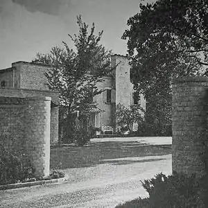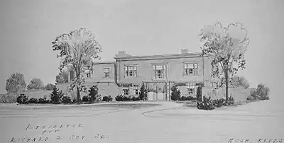Hudson Tannahill House is the earliest example of what would become Keyes's signature distinctive Regency style: white brick construction (with brick pilasters), strong symmetrical façade, a hipped roofline partially concealed by a parapet (giving the appearance of a flat roof), a dormered (garage) wing, and low walls of matching construction. The house has a motor courtyard behind electric gates, and an attached conservatory that overlooks adjacent Lake St. Clair. The estate was built for Robert Hudson Tannahill (a foremost art collector, patron, and scion of J. L. Hudson's department store fortune[39]). Tannahill had one of the most extensive and "peerless"[40] private late 19th and early 20th-century European art collections in the world. He built his home on Lee Gate Lane specifically to accommodate his sprawling collection—and he looked hard to find an architect to match the quality of his art. (Tannahill and his close first cousin Eleanor Clay Ford, wife of Edsel, had a long relationship with recently deceased Albert Kahn, and Tannahill's choice of Keyes as next in line to design his home is a testament to Keyes's standing at the time. Keyes, like Tannahill, nonetheless remains relatively unknown today.)[41] When Tannahill was having the house designed and built in the 1940s, he was becoming increasingly "reclusive and protective of his art."[42] The house "was like a museum"—though "he seldom showed his collection"—with major works of art as well as many small, elegant pieces. His 5-foot-tall Woman Seated in an Armchair (which he called "the mistress of the house"), as well as a parade of other Picassos, dramatically adorned the house's stairwell,[39] a Renoir nude adorned the living room, and a Matisse still life hung over the dining room table.[41] "Tannahill was loath to lend art he kept in his home, preferring to be surrounded by their beauty. Still, he enjoyed entertaining friends and family there," which "evoked the atmosphere of the great French salons." He donated almost 500 pieces of art to the Detroit Institute of Arts during his life, and upon his death in 1969 he bequeathed another 557 pieces (ranging from Impressionist masterpieces to African miniatures) as well as a large acquisition endowment. (Tannahill's gifts, valued at around half-a-billion dollars, "have become among the most recognizable and highly prized paintings" in the museum's world-class collection—all of which he notably restricted from sale and thus protected from creditors.)[41] Tannahill had the house "built like a bunker, meant to stop the spread of fire" in order to protect his art, using "stout walls and ceilings" made of "a lot of cement"[43] (and the parapet exterior wall extending above the roof was commonly used as a fire wall). Ironically, the roof was badly damaged in a fire on November 14, 2014 during renovations by a new owner.[43]