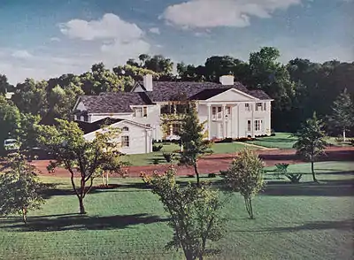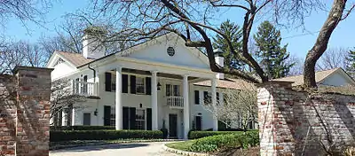 As the center of industrial wealth in the region shifted from Grosse Pointe to Bloomfield Hills, so too did Keyes's projects. Keyes had already been working in Bloomfield Hills (starting in the 1930s—see Welch and Lake Park House below) when Louis Clifford Goad (Executive Vice President of General Motors Company[28]) hired him to design his estate there.[9] Goad House was featured in Fortune magazine in 1955 (alongside projects of Philip Johnson, Edward Durell Stone, and David Adler) as an example of the first resurgence of Americans "building big expensive houses again" since the Great Depression (with reference to Keyes designing several at the time).[29] Goad House is privately nestled off of evergreen-lined Lone Pine Road, within view of historic Christ Church and down the road from Albert Kahn's Cranbrook House. The twelve-room house incorporates Keyes's signature symmetrical bow-fronted wings, clean white brick façade and wrought iron railings, and includes contrasting French shutters and a Palladian, Ionic colonnaded and pedimented front portico with spiral volutes. Fortune said that "Mrs. Goad's desire for southern-style pillars and white-painted brick was gratified by architect Hugh Keyes. As in many other big houses, the formal living room and dining room are seldom used; the family lives in the library or on the porch (conservatory), usually eats in the breakfast room. The house has an ultra-mechanized kitchen installed by G.M."[29] The integrated conservatory overlooks the south sloping grounds, with an unusual oval, stone, and "terraced garden and wooded section which lead to a stream,"[30] a tributary of the River Rouge. The exterior of the house was a filming location in the 2013 film The Ides of March, as the senator's mansion. (Keyes's McLouth House, a block away, was used as the formal interior of the house in the film.)[31] Goad died in the house in 1979.[32]