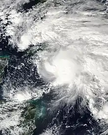 Steered westward by a low-to-mid-level ridge that extended from the subtropical Atlantic southwestward to Cuba and The Bahamas, Eta slowly organized throughout the day as a central dense overcast began to form atop its low-level center.[7] Surrounded by an environment of low vertical shear and high sea surface temperatures, Eta began to explosively intensify on November 2. It became a hurricane by 06:00 UTC that day, while located about 310 mi (500 km) south of Grand Cayman.[3] Nine hours later, it strengthened into a high-end Category 2 hurricane as a small pinhole eye became apparent in visible satellite imagery.[8] Its sustained winds increased to Category 4 intensity by 18:00 UTC that day, an increase of 50 mph (80 km/h) in about 12 hours. Eta's maximum sustained winds peaked at 150 mph (240 km/h) at 00:00 UTC on November 3; at the same time, the storm had a central pressure of 929 mbar (27.4 inHg). Eta then begun to slow down and turn southwestward in response to a mid-level ridge over the western Gulf of Mexico and Mexico. Even so, its maximum sustained winds remained unchanged through 06:00 UTC, during which time its minimum pressure fell to 922 mbar (27.2 inHg), with the storm reaching its peak intensity.[3] The Washington Post reported that several meteorologists believed that Eta peaked as a Category 5 hurricane based on satellite imagery estimates, as well as a lack of aircraft observations due to several mechanical issues;[9] however, in their post-season report, the NHC determined that Eta peaked as a 150 mph (240 km/h)-Category 4 hurricane.[3] Despite remaining in a very favorable environment, Eta began to weaken soon thereafter, due to an eyewall replacement cycle.[10] After drifting just offshore of the Caribbean coast of Nicaragua for several hours on November 3,[3] the hurricane made landfall just as it completed its eyewall replacement cycle at 21:00 UTC about 15 mi (24 km) south-southwest of Puerto Cabezas, Nicaragua, with maximum sustained winds of 140 mph (230 km/h).[11] A storm surge of 26–33 feet (7.9–10.1 m) was reported at landfall.[3] Once inland, the hurricane rapidly weakened as it moved slowly westward over northern Nicaragua, diminishing to Category 2 intensity three hours after landfall,[12] and to a tropical storm by 12:00 UTC on November 4.[13] Twelve hours later, around 00:00 UTC on November 5, Eta weakened to a tropical depression while its center was located about 80 mi (130 km) east of Tegucigalpa, Honduras. By 06:00 UTC that morning, the storm degenerated into a remnant low, though it maintained its low-level vorticity maximum.[3] Operationally, the NHC continued issuing advisories on "Tropical Depression Eta" due to uncertainties about whether or not the surface circulation had dissipated.[14][15]