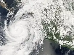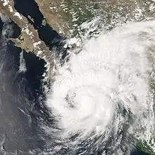 Henriette continued to improve in structure and with the formation of a distinct eye feature, reached hurricane strength on September 4 as it turned north-northwestward toward the Baja California peninsula, ahead of a mid-latitude trough approaching the west coast of the United States.[5] The hurricane reached its peak intensity of 85 mph (135 km/h) that morning while centered about 75 miles (120 km)south-southeast of Cabo San Lucas.[1]