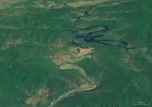 ![]() View of the dam as seen by Landsat, 3D elevation model (yellow item in the middle of the image). | |