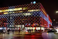 The renovation of Industriens Hus only retained the concrete decks and pillars of the original building. Two floors were added so that the building now reaches eight storeys towards the street while it gradually drops towards Tivoli Gardens to reduce the impact on the historic premises. The glazed façade consists of 3,331 5-square metres pieces of glass and features 3.9 km of LED panels with more than 80,000 diodes.[4] The building has been criticized for its monotonous appearance in the daytime.[5]