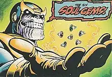 The first appearance of an Infinity Gem occurred in 1972 in Marvel Premiere #1. It was originally called a "Soul Gem".[1][2] In 1976, a second "Soul Gem" appeared in a Captain Marvel story which established that there were six Soul Gems, each with different powers.[3] One year later, two more "Soul Gems" were introduced in a Warlock crossover involving Spider-Man.[2] The main six Gems appeared when the death-obsessed villain Thanos attempted to use them to extinguish every star in the universe.[2][4] In a 1988 storyline in Silver Surfer vol. 3, the Elders of the Universe tried to use 6 of the "Soul Gems" to steal the energy of the world-eating entity Galactus.[2]