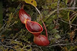 The second major group of pitcher plants are the monkey cups or tropical pitcher plants of the genus Nepenthes. In the hundred or so species of this genus, the pitcher is borne at the end of a tendril, which grows as an extension to the midrib of the leaf. Most species catch insects, although the larger ones, such as Nepenthes rajah, also occasionally take small mammals and reptiles. Nepenthes bicalcarata possesses two sharp thorns that project from the base of the operculum over the entrance to the pitcher. These likely serve to lure insects into a precarious position over the pitcher mouth, where they may lose their footing and fall into the fluid within.[25]
