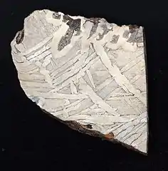 ![]() Widmanstätten pattern as seen on an etched and polished slice of the Seymchan meteorite. Scale unknown. | |