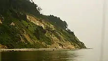 The coastline of Isgård to the south and the east consists of steep, often eroding, slopes down to the sea with a walkable beach, where the tidal difference is normally less than one foot.[5] The hilly moraine deposits in the area are dominated by different types of clay with spots of sandy material in between.[3]