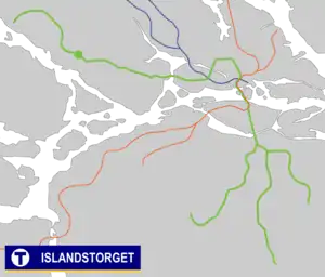 Islandstorget is a station in the Stockholm metro on the Green line. It is located in the district of Södra Ängby, which is part of the borough of Bromma in the west of the city of Stockholm. The station is above ground with a single island platform. The entrance is from Blackebergsvägen, which passes over the line. On a workday there are some 3,450 passengers who travel from Islandstorget.[1][2][3]