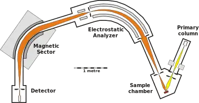 SIMS is a common method used in U-Pb analysis, as the primary ion beam is used to bombard the surface of a single zircon grain in order to yield a secondary beam of Pb ions. The Pb ions are analyzed using a double focusing mass spectrometer that comprises both an electrostatic and magnetic analyzer. This assembly allows the secondary ions to be focused based on their kinetic energy and mass-charge ratio in order to be accurately collected using a series of Faraday cups.[10]