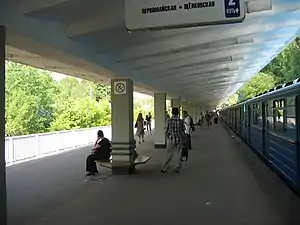 Izmaylovskaya (Russian: Измайловская) is a Moscow Metro station on the Arbatsko-Pokrovskaya Line. It is one of the few surface level stations of the system. Moscow's harsh winters make above-ground stations impractical , but the design nonetheless enjoyed brief popularity between 1958 and 1966 because of the low construction costs. Izmaylovskaya was built in 1961 to replace the old Pervomayskaya station, which had been in use since 1954. The design of the station features an elevated vestibule, reached from the street via two flights of steps, which sits on top of the ground-level platform. The platform is relatively spartan, with a canopy providing some protection from the elements and pillars faced with white marble. The architect was Ivan Taranov. The station has a direct entrance to one of Moscow's largest parks, Izmaylovsky Park.
