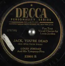 "Jack, You're Dead" is a song written by Dick Miles and Walter Bishop. It was performed by Louis Jordan and his Tympany Five, recorded in October 1946, and released on the Decca label (catalog no. 23901-B).[2] The song describes a man's physical state if he fails to respond to romance.[3]