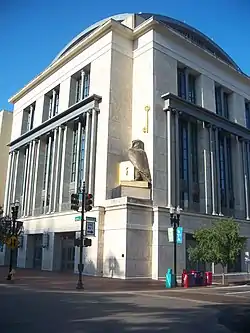 The library was two stories tall, made of limestone and copper. Its design was Classic Revival Greek Ionic, typical of Carnegie libraries, and featured four columns on the facade. Many Carnegie libraries were built in this Neoclassical style with imposing pillars and a tidy lawn, conveying reverence for the printed word.[26] It has been described as nearly fireproof, with wood only in the floors, doors and sash. By 1910, the library was outgrowing itself. The library made use of deposit stations and sub branches, but space in the Carnegie building became an increasingly rare commodity. Thus, in the 1920s a branch system was inaugurated which continues to flourish to this day.[27] Today the Carnegie library building houses a law firm and it is known as the Bedell Building.[28]