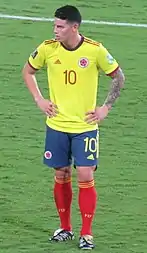 James started his international career with the Colombia under-20 team, with which he won the 2011 Toulon Tournament. He then captained the U-20 team during the 2011 FIFA U-20 World Cup. Due to his performance in the tournament, he was regularly called into the senior squad by the age of 20. He played in the 2014 and 2018 FIFA World Cup, winning the Golden Boot in 2014 and being included in the Cup's All Star Team.[8][9] He also represented his nation at the 2015 Copa América, the Copa América Centenario in 2016, and the 2019 Copa América, winning a third-place medal in 2016.