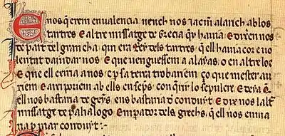 E nós que érem en ualencia uench-nos Jacme Alarich ab los tartres e altre missatge de Grècia que y havia, e dixeren-nos de part del gran cha, qui era Rei dels tartres, que ell hauia cor e volentat d'ajudar-nos, e que venguéssem a alayas o en altre loc e que ell eixiria a nós, e per sa terra trobaríem ço que mester auríem e així poríem ab ells ensems conquerir lo Sepulcre. E deïa que ell nos bastaria de "genys", e ens bastaria de conduit. E dix-nos l'altre missatge de Palialogo, emperador dels grechs, que ell nos enviaria per mar conduit