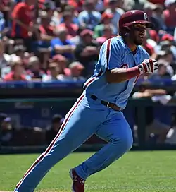 On April 11, 2015, he was placed on the restricted list and suspended indefinitely following his arrest for a domestic violence incident.[4] The Phillies added him to their 40-man roster after the 2016 season.[5] After he was activated off the restricted list, he returned to Clearwater, where he spent the whole season, posting a .273 batting average with one home run and 14 RBIs in 31 games. In 2016, he spent time with both the Reading Fightin Phils and the Lehigh Valley IronPigs, batting .269 with nine home runs, 52 RBIs and a .736 OPS in 125 combined games between both teams. He spent 2017 with Lehigh Valley where he batted .229 in 29 games[6] before a separated shoulder caused him to miss the remainder of the season.[7] He began 2018 with Lehigh Valley.