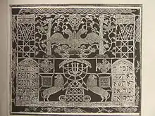 A Mizrah (hebr. The East) is a plaque hung on the east wall of private houses to show the direction of Jerusalem. A shivis’i (hebr. always) is similar to a mizrah, but it hangs on the east side of a synagogue. Its name is connected with a sentence from the Bible: 'Shivis'i adonai l'negdi tamid' ('I have set the LORD always before me').[23]:4 Shivis’i in the form of paper cuts rather than some more durable material were only used in poor synagogues.
