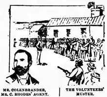 Colenbrander joined the Natal Mounted Police, an all-white militarised colonial police force, in 1870.[8] When the Stanger Mounted Rifles, a colonial volunteer military unit, was founded in 1875 he transferred to that unit.[4] During the 1879 Anglo-Zulu War he saw action at the 22 January Battle of Inyezane and the 2 April Battle of Gingindlovu.[4][2] At the latter battle he met John Robert Dunn, a British settler in Zululand who had been made a chief by Cetshwayo, the king of the Zulu.[2]
