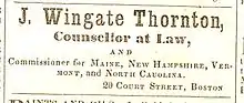 | April 1845 | 26 | Placed an advertisement in the new Saco, Maine newspaper, The Union. The ad reads: J. Wingate Thornton, Counsellor at Law, and Commissioner for Maine, New Hampshire, Vermont and North Cauolina. 20 Court Street, Boston (The Union, Saco, ME, Vol. 1, #10, April 11, 1845)