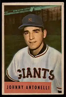 In February 1954, Antonelli was dealt to the New York Giants as a major piece in a six-player trade for veteran outfielder Bobby Thomson, one of the most popular Giants since his "Shot Heard 'Round the World" pennant-winning home run of 1951. Mays' biographer James S. Hirsch wrote that the trade was difficult for the Giants, particularly owner Horace Stoneham, who tried to be loyal to long-time members of the organization; however, the Giants needed pitching reinforcement in order to compete.[20] "It was the best break of my career," Antonelli said of the transaction.[2] Facing Milwaukee on June 9, he threw a seven-hit shutout, outpitching Spahn in the Giants' 4–0 triumph.[21] On the strength of an eight-decision winning streak, he was selected to the All-Star team for the first time.[3] He threw a three hit shutout against the Phillies on July 5; Antonelli had also allowed three hits in a shutout victory over them on April 25.[22] Pitching on three days' rest on July 20, on a day when it was over 100 °F (38 °C) at Crosley Field in Cincinnati, Antonelli showed what sportswriter John Drebinger called "an extraordinary display of stamina," pitching all 13 innings of a 2–1 victory over the Cincinnati Redlegs.[22][23] He won 11 straight decisions from May 25 through August 1.[22] With fellow starters Sal Maglie and Rubén Gómez, Antonelli made starting pitching the Giants' strength.[24] In 1954, Antonelli went 21–7, led the league in ERA (2.30) and shutouts (six), and pitched the Giants to the pennant. He and fellow Giant Hoyt Wilhelm led the NL in winning percentage, with a .750 mark.[2] Antonelli, Maglie, and Gomez combined to win 52 games, complete 37 starts, and help the Giants pitchers post an ERA of 3.09, the lowest in the National League.[25][26] Hirsch wrote that Antonelli was "[t]he Giants' best pitcher that year," and Antonelli won The Sporting News Pitcher of the Year Award, as well as finishing third in NL Most Valuable Player (MVP) voting (the Cy Young Award had not been introduced yet).[2][27] Against the Cleveland Indians in the 1954 World Series, Antonelli started Game 2, pitching in and out of trouble all day but allowing one run and outpitching Hall of Famer Early Wynn to earn the victory in the Giants' 3–1 triumph.[28] "The Good Lord was on my side that game," he later said in an interview. "I don’t think I had my best stuff that day."[3] In Game 4, he entered with one out and a runner on first in the eighth inning, then retired five of the six hitters he faced, earning a save in the 7–4 victory as the Giants pulled off a four-game sweep.[29]