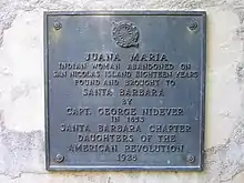 Just seven weeks after arriving on the mainland, Juana Maria died of dysentery in Garey, California. Nidever claimed her fondness for green corn, vegetables and fresh fruit after years of little such nutrient-laden food caused the severe and ultimately fatal illness.[8] Before she died, Father Sanchez baptized and christened her with the Spanish name Juana Maria.[16] She was buried in an unmarked grave on the Nidever family plot at the Santa Barbara Mission cemetery. Father González Rubio made the following entry in the Mission's Book of Burials: "On October 19, 1853 I gave ecclesiastical burial in the cemetery to the remains of Juana Maria, the Indian woman brought from San Nicolas Island and, since there was no one who could understand her language, she was baptized conditionally by Fr. Sanchez."[15] In 1928, a plaque commemorating her was placed at the site by the Daughters of the American Revolution.