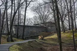 The Street family considered Harrison a skyscraper architect, so his decision to both plan and supervise the construction of their house in Scarborough, a hamlet of the village of Briarcliff Manor, surprised them.[12] By October 6, 1937, the house that Harrison constructed had one story of stone in the shape of an L, with a short stone wall extending from the back of the house, and a ramp path with a serpentine wall running up along the front of the house to the entrance.[11] By March 7, 1938, the two-story house was completed.[13] The finished house was built of local fieldstone in the shape of an L, using steel beams on the roofs of the house and garage, with sixteen-inch walls,[14] glass porthole windows, and large panes of glass and doors on the back of the house—it was related in design to other early Modernist houses constructed in the late 1930s by the Modernists Walter Gropius and Marcel Breuer.[12] Breuer was a proponent of the more modern International Style,[15] and Gropius, as Director of the Bauhaus in Germany, applied the International Style when he designed the school's faculty housing and building around 1925 to 1926.[16] Gropius and Breuer represented a new form of architectural design, one that did not look to the past, but rather to modern industry for inspiration.