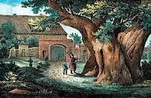 During a fire in east Kaditz in 1802 the parsonage too was damaged, whilst the lime tree was once again barely touched. A lithograph from approximately 1802 by the artist Gustav Taubert shows the burned out parsonage with the lime tree and church in the background. In 1812 Napoleon's soldiers trooped through the village past the lime tree.[16] An excerpt from page 128 of the book Dresden und das Elbgelände (Dresden and the area around the river Elbe), which was published in 1818 by the Association for the Promotion of Dresden and its Tourism, reads "An ancient lime tree in the churchyard".[17]