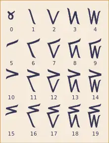 The Kaktovik numerals or Kaktovik Iñupiaq numerals[1] are a base-20 system of numerical digits created by Alaskan Iñupiat. They are visually iconic, with shapes that indicate the number being represented.