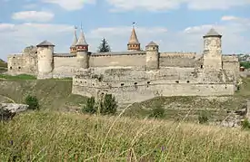 Kamianets-Podilskyi Castle (Ukrainian: Кам'янець-Подільська фортеця; Polish: twierdza w Kamieńcu Podolskim; Lithuanian: Podolės Kameneco tvirtovė) is a former Ruthenian-Lithuanian[1] castle and a later three-part Polish fortress[2][3][4] located in the historic city of Kamianets-Podilskyi, Ukraine, in the historic region of Podolia in the western part of the country. Its name is attributed to the root word 'kamin', from the Slavic word for 'stone'.