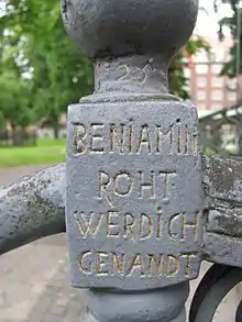 Karl XII's Stair is the double staircase that leads from the cemetery up to the southern entrance of the church and is so named because of its ornate railing. It was built sometime between 1712 and 1715 and was dedicated in 1715 as indicated by the date on the portion on the stair's landing. The stair's namesake is Charles XII of Sweden who was king at the time, and his royal monogram appears above the dedication date. The railing was made by the Blacksmith Benjamin Roth and renovated by his son, Carl Roth, in 1776. On the pillars on either side of the stair is engraved a poem about Karl XII: