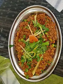 Keema matar (English: "mince and peas"),[1] also rendered Qeema matar, is a dish from the Indian subcontinent associated with the Mughals. The term is derived from Chaghatai Turkic قیمه (minced meat) which is cognate with Turkish kıyma (minced or ground meat).