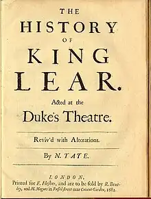 All theatres were closed down by the Puritan government on 6 September 1642. Upon the restoration of the monarchy in 1660, two patent companies (the King's Company and the Duke's Company) were established, and the existing theatrical repertoire divided between them.[63] And from the restoration until the mid-19th century the performance history of King Lear is not the story of Shakespeare's version, but instead of The History of King Lear, a popular adaptation by Nahum Tate. Its most significant deviations from Shakespeare were to omit the Fool entirely, to introduce a happy ending in which Lear and Cordelia survive, and to develop a love story between Cordelia and Edgar (two characters who never interact in Shakespeare) which ends with their marriage.[64] Like most Restoration adapters of Shakespeare, Tate admired Shakespeare's natural genius but saw fit to augment his work with contemporary standards of art (which were largely guided by the neoclassical unities of time, place, and action).[65] Tate's struggle to strike a balance between raw nature and refined art is apparent in his description of the tragedy: "a heap of jewels, unstrung and unpolish't; yet so dazzling in their disorder, that I soon perceiv'd I had seiz'd a treasure."[66][67] Other changes included giving Cordelia a confidante named Arante, bringing the play closer to contemporary notions of poetic justice, and adding titilating material such as amorous encounters between Edmund and both Regan and Goneril, a scene in which Edgar rescues Cordelia from Edmund's attempted kidnapping and rape,[68][69] and a scene in which Cordelia wears men's pants that would reveal the actress's ankles.[70] The play ends with a celebration of "the King's blest Restauration", an obvious reference to Charles II.[lower-alpha 3]