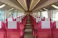 Seating in cars 1, 2 and 4 are arranged 2+2 transverse, with a seat pitch of 1,050 mm (41 in). Car 3 is a deluxe car and features rotating and reclining seats arranged 2+1 transverse with AC outlets built into the armrest and tables which fold out. Cars 2 and 3 come with heated toilets and are equipped with automatic bidets.[2]