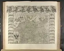 Klencke Atlas is a singular work; no other copies were created. It is a world atlas made up of 41 copperplate wall maps that remain in exceptionally good condition.[3] The maps were intended to be removed and displayed on the wall.[1] The maps are of the continents and assorted European states[4] and it was said to encompass all the geographical knowledge of the time.[5] Dutch Prince John Maurice of Nassau is credited with its creation,[5] and it contains engravings by artists Joan Blaeu and Hondius and others.[4]