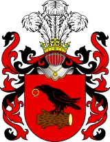 "Korwin III – In a red field there is a black raven with a gold ring in its beak, over a cut stump lying across, between two knots on each side. Above the helmet and the coronet there is the same raven with a ring. There are similarities between the crest of this variation and the crest of Ślepowron coat of arms."