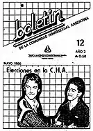 The activist organization Comunidad Homosexual Argentina (CHA; English: "Argentine Homosexual Community") published various magazines and newsletters between 1984 and 1992.[92] The first one was the bulletin Boletín de la CHA—published during Carlos Jáuregui's presidency of the group between 1984 and 1986—which was followed by Vamos a Andar.[92] The CHA simultaneously released other publications, including the weekly Boletín informativo (lit. 'newsletter'), Artículo 19 and Vamos a Andar MUJER.[92]