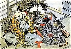In the pre-Meiji era, nanshoku (男色) relationships inside Buddhist monasteries were typically pederastic. The older partner, or nenja (念者, "lover" or "admirer"), would be a monk, priest or abbot, while the younger partner was assumed to be an acolyte (稚児, chigo), who would be a prepubescent or adolescent boy.[28] The relationship would be dissolved once the boy reached adulthood (or left the monastery). Both parties were encouraged to treat the relationship seriously and conduct the affair honorably, and the nenja might be required to write a formal vow of fidelity.[29] During the Tokugawa period, some of the Shinto gods, especially Hachiman, Myoshin, Shinmei and Tenjin, "came to be seen as guardian deities of nanshoku" (male–male love).