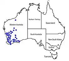 It is found in the IBRA regions of: the Avon Wheatbelt, the Jarrah Forest, and the Murchison bioregion, on sandy soils in shrublands and woodlands.[3]