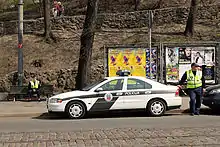 A Volvo S60 patrol car in 1991 livery and officers in Riga, 2011